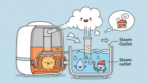 お湯を沸かしている以上、安全性のリスクは他の方式より高く、熱い蒸気が出るので、吹き出し口にうっかり手をかざすと熱いので注意。