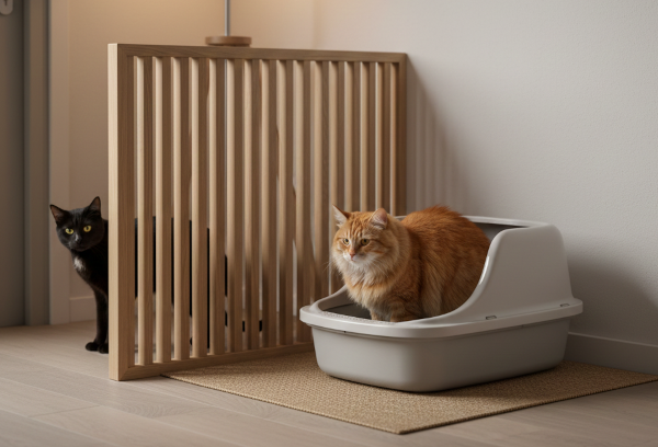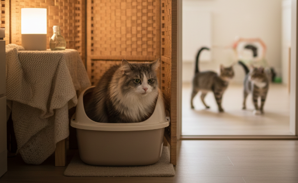 若い猫が活発に遊ぶエリアから少し離れた「静かな場所」にシニア専用トイレを置くことで、排泄中に若い子に飛びかかられるリスクを減らせます。