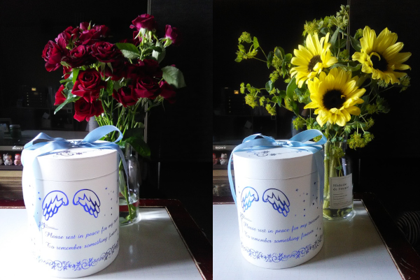 手向けの花は生花をテーブルに飾っていますが、ケースには写真を飾りたいですし、プリザーブドフラワーなども入れたいと考えました。