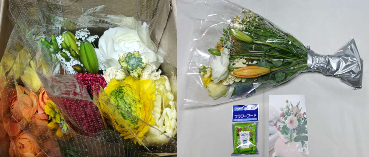 お花に元気がないなと感じたら、「開封直後の写真」「水揚げ後の写真」というように、「最初の状態から水揚げしたけどダメだったという経過」がわかるとスタッフも把握しやすいと思います。