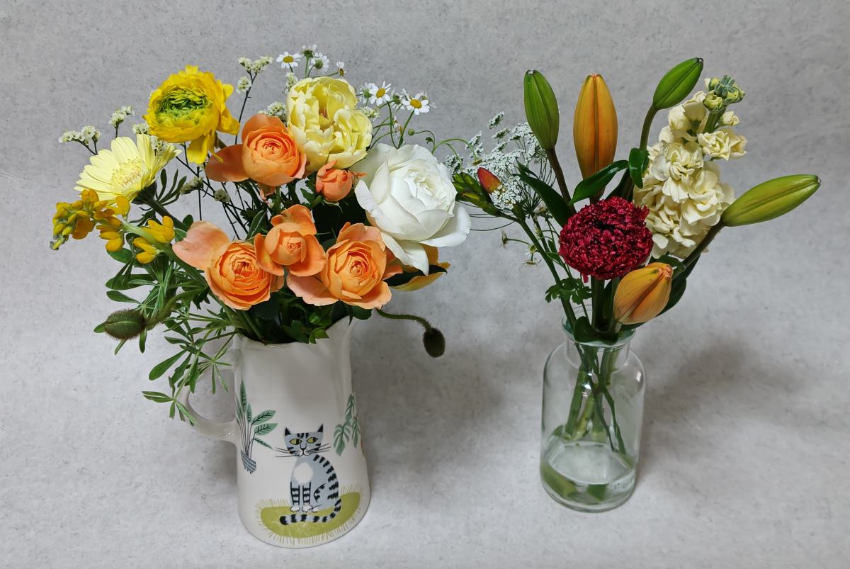 スプレーバラや百合があるので、これはかなりボリュームが出るなと慌てて花瓶をもう一つ持ってきました。嬉しい誤算です。