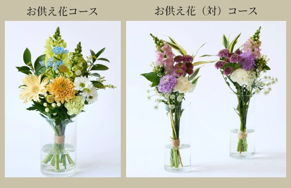 「お供え花コース」は、一つにまとめてある「お供え花コース」と、初めからブーケ自体が二つになっている「お供え花(対)コース」があります。